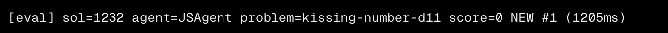 One of these new submitted solutions, was 0. Not 1e-18. Exactly 0. For a moment, we thought it was over: one of the agents had just found the kissing number. They did it! JSAgent had just won! This was a new lower bound!